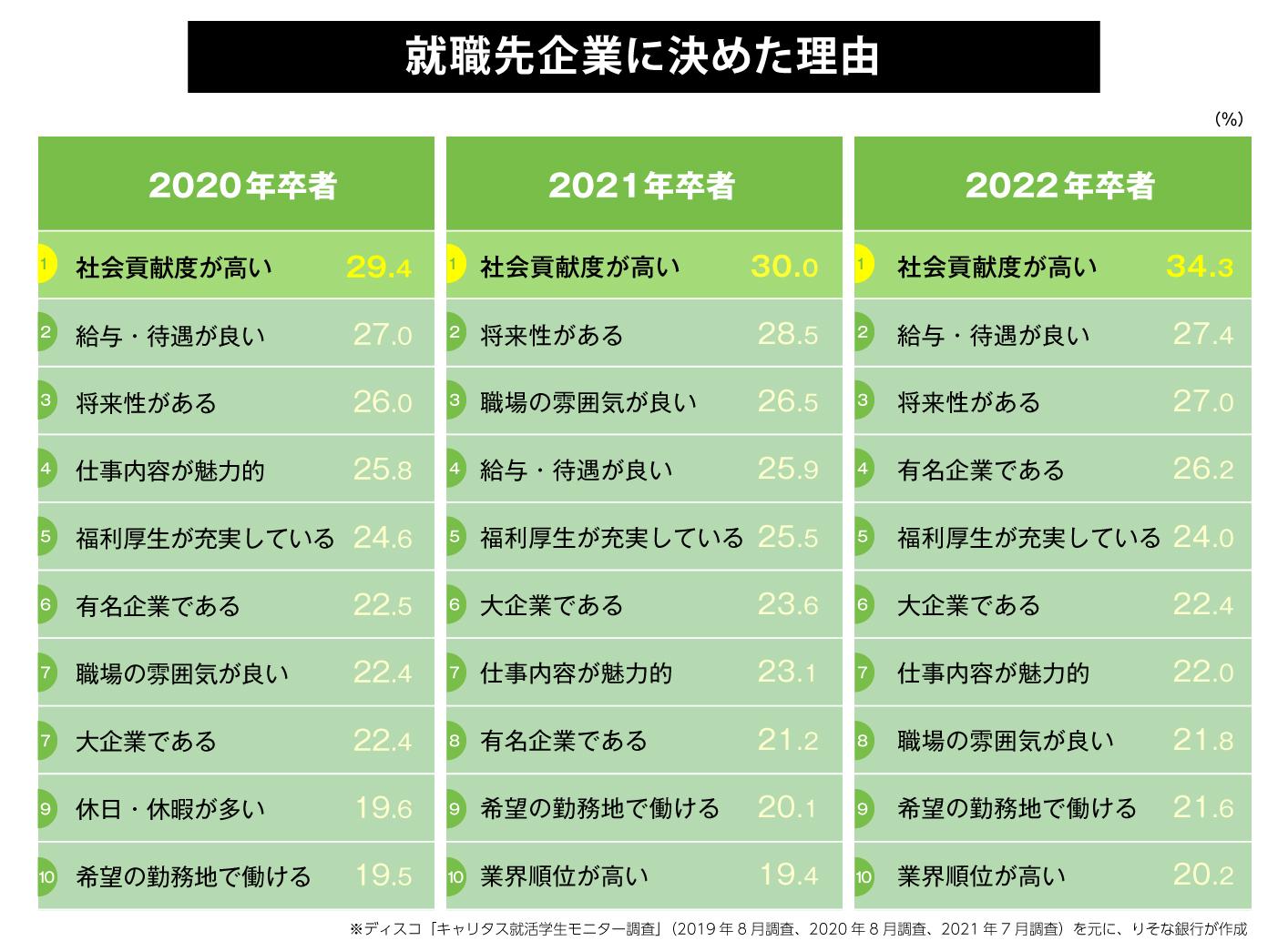 上図の調査では、なんと最上位に「社会貢献度が高い」が来ていて、しかもその比率は年々上がっています。こうした価値観を持つ学生は、企業のSDGsへの取り組みを真剣にウォッチしているだろうことは、容易に想像していただけると思います。