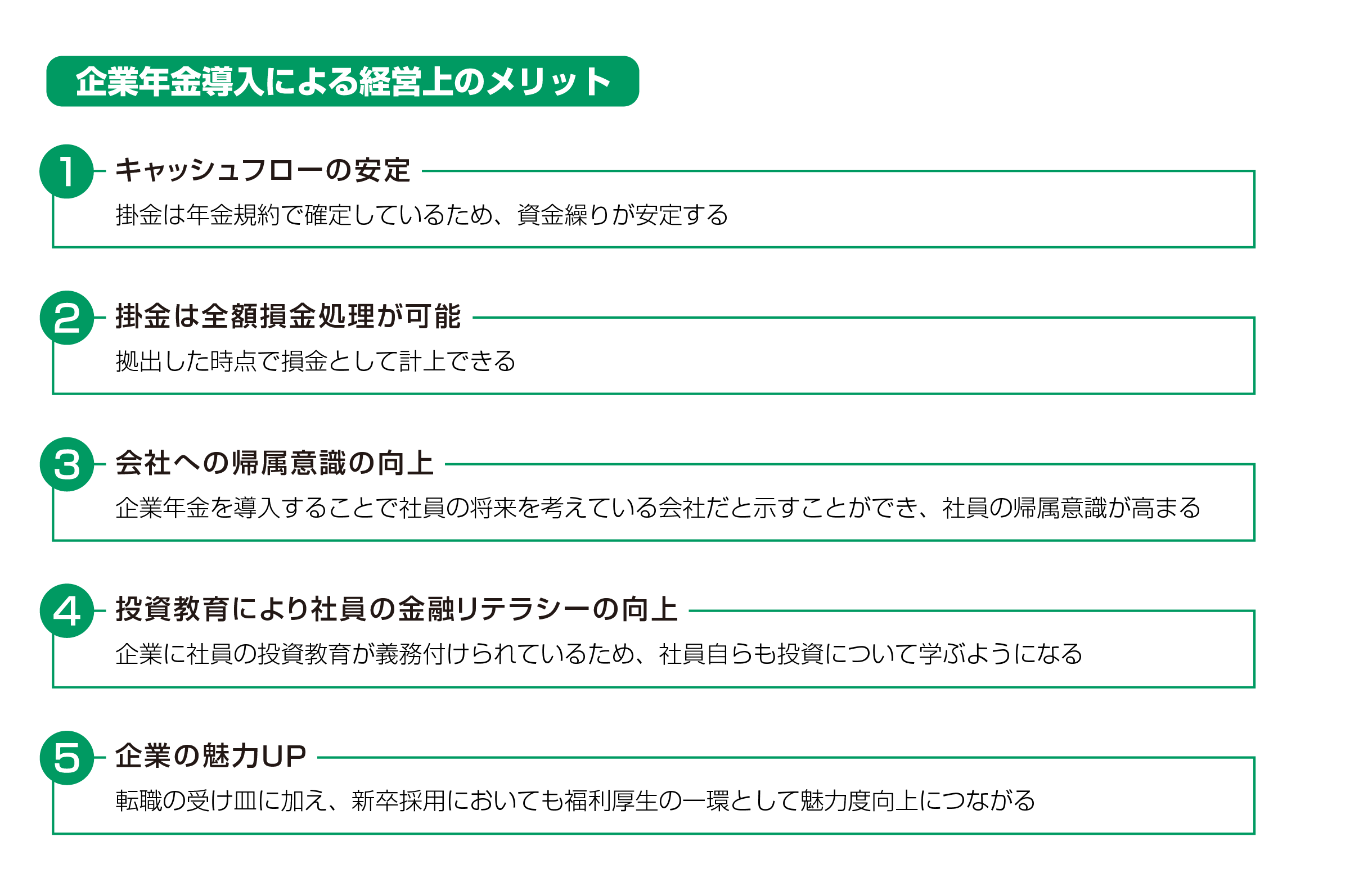 企業年金導入による経営上のメリット 1.キャッシュフローの安定:掛金は年金規約で確定しているため、資金繰りが安定する 2.掛金は全額損金処理が可能:拠出した時点で損金として計上できる 3.会社への帰属意識の向上:企業年金を導入することで社員の将来を考えている会社だと示すことができ、社員の帰属意識が高まる 4.投資教育により社員の金融リテラシーの向上:企業に社員の投資教育が義務付けられているため、社員自らも投資について学ぶようになる 5.企業の魅力UP:転職の受け皿に加え、新卒採用においても福利厚生の一環として魅力向上につながる