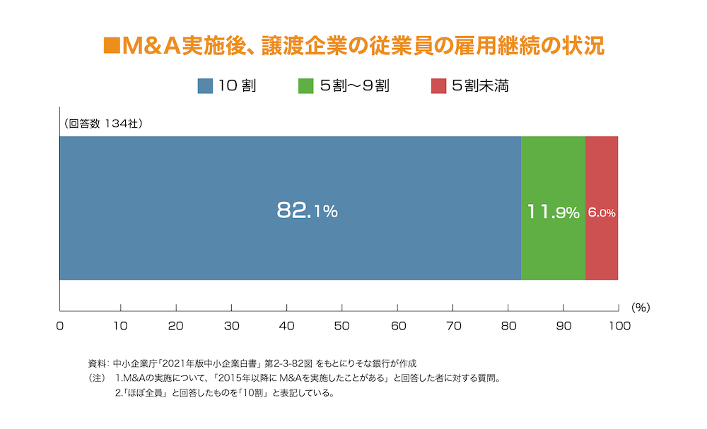 また、M&A後に従業員の雇用が維持されるかどうかも経営者にとって関心が高い事柄ですが、8割以上のケースで雇用が完全に維持されるとの結果が示されています(※3)。新たな経営陣が企業の持続可能性を高められれば、さらなる雇用を生み出すことも可能になるでしょう。