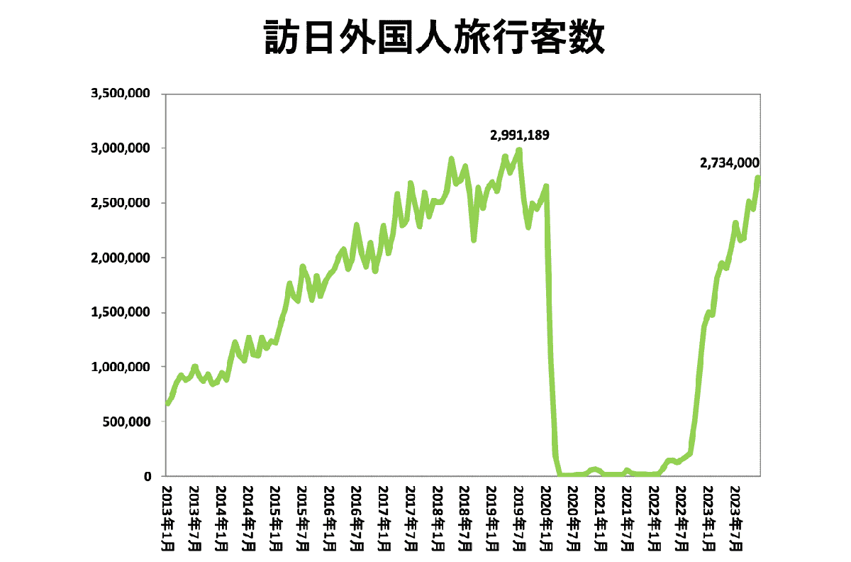 - 日本政府観光局によると、2023年12月の訪日外客数は273.4万人(2019年同月比108.2%)と12月としては過去最高になり、コロナ禍以降でも最高値を更新しました。また、2023年の年間訪日外客数は2,506万6,100人となり、4月の水際措置撤廃以降、右肩上がりで急速な回復が進んでおり、年間累計では2019年比78.6%まで戻りました。