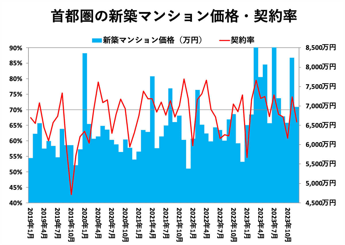 - 首都圏の新築分譲マンション価格は、2023年は前年比+28.8%の8,101万円となっており、年間平均価格としては5年連続の上昇で最高値を大幅に更新しました。エリア別では特に東京23区の高騰が顕著であり、1億1,483万円と年間平均では初めて1億円を突破しました。また、契約率は70.3%と3年連続の70%台となりました。足元2023年12 月の平均価格は6,970万円(前年同月比+25.4%)、契約率は66.1%(同▲8.7ポイント)となっています。