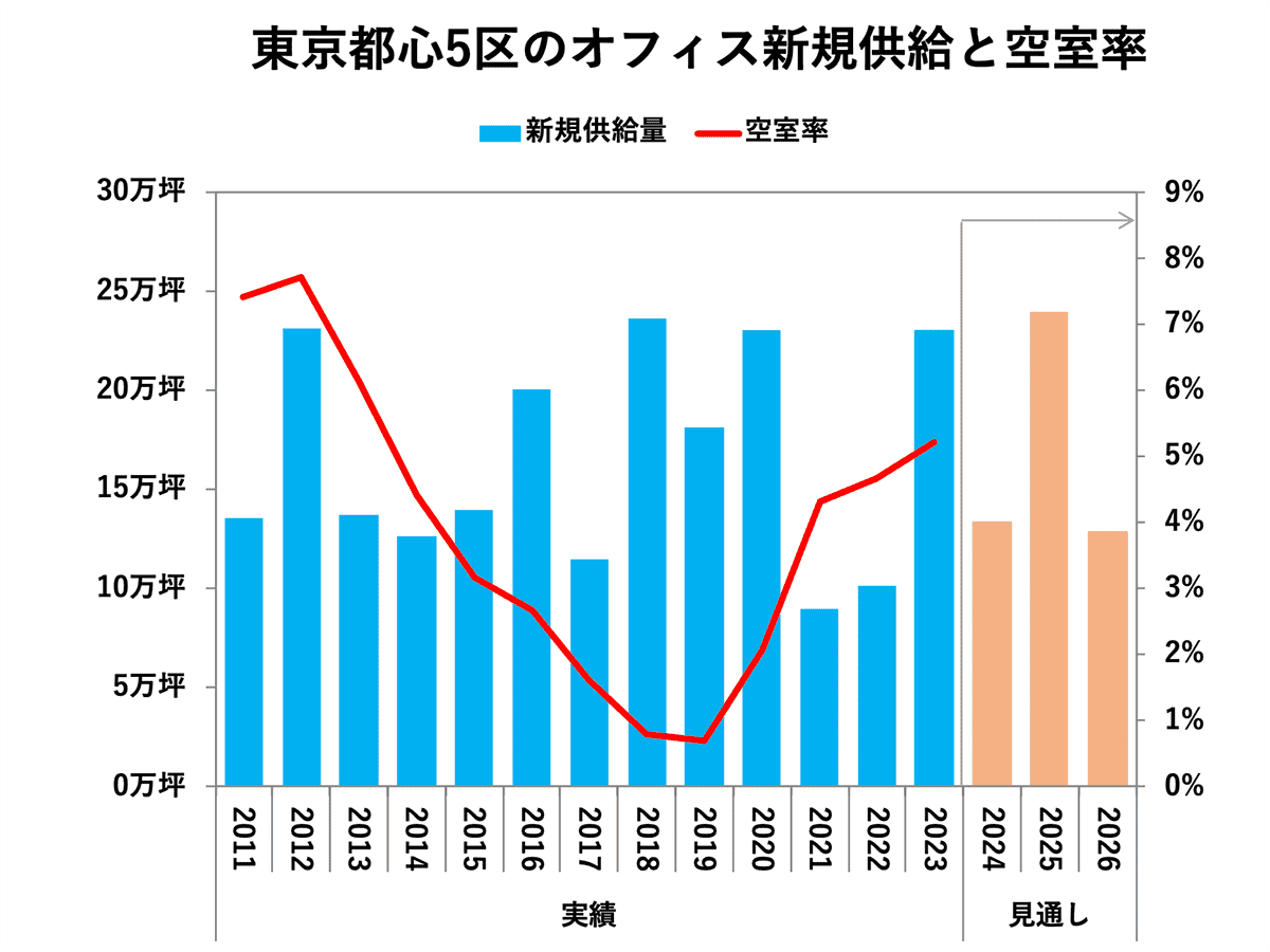 - 三幸エステートによると、2024年以降も大量の新規供給が予定されており、特に2025年は約24万坪と2010年以降で最も多い供給量となる見込みです。東京ビジネス地区全体では2023年の大量供給による大きな影響はみられていませんが、今後の市場動向に注意が必要と思われます。
