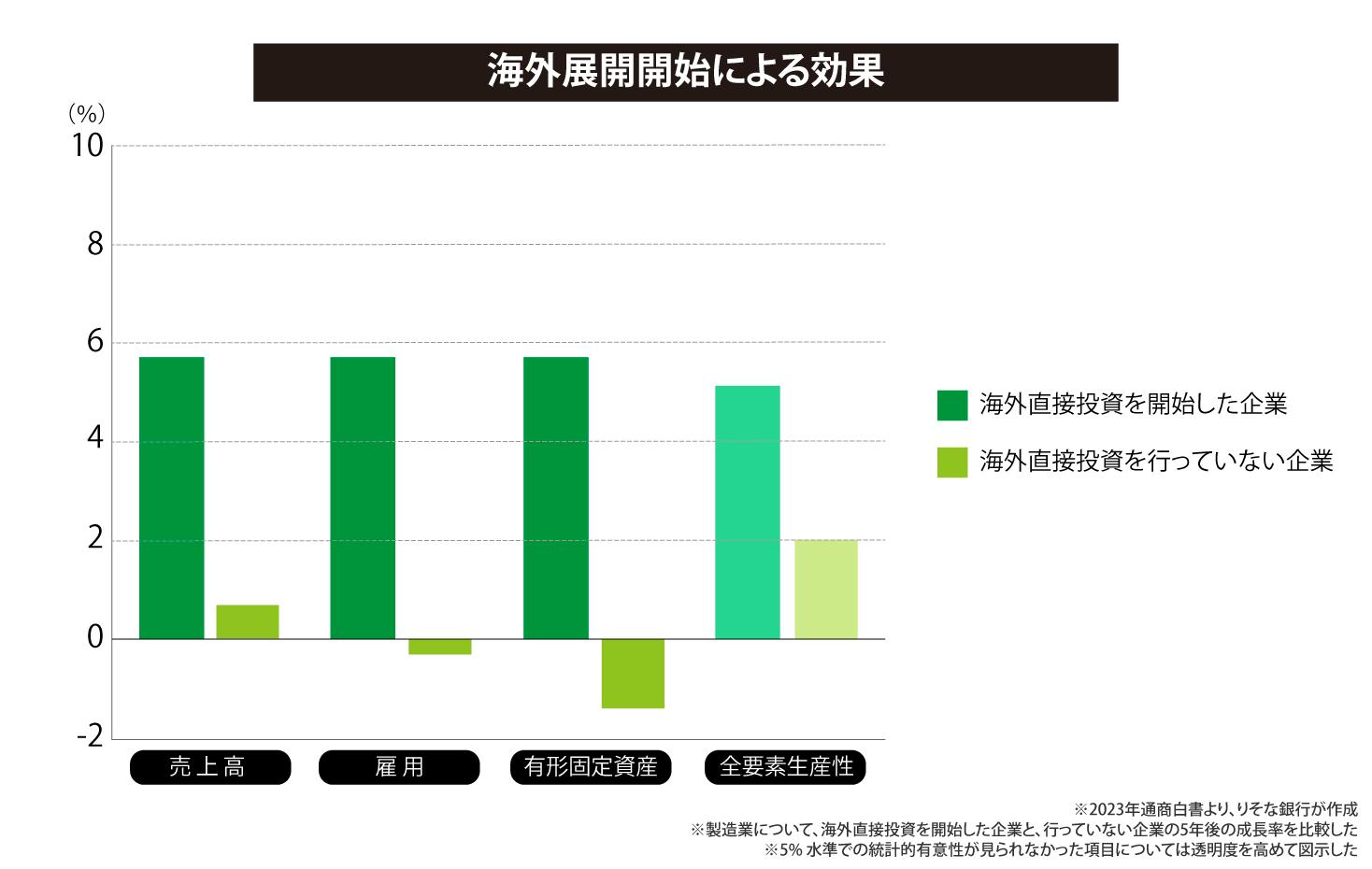 通商白書の分析でも、海外展開をする企業の成長性は、行っていない企業と比べると高いことが示されています(下図参照)。