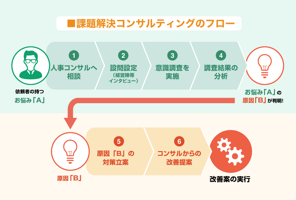 まず、人事コンサル会社は「お悩みA」について相談を受けます。そして社内で何が起こっているのか、現場で働く従業員の状況把握のため「お悩みA」を念頭に従業員意識調査を実施。調査結果の分析により「お悩みA」を引き起こしていた「原因B」が判明。原因が明確になったら、解決するための改善策をご提案します。