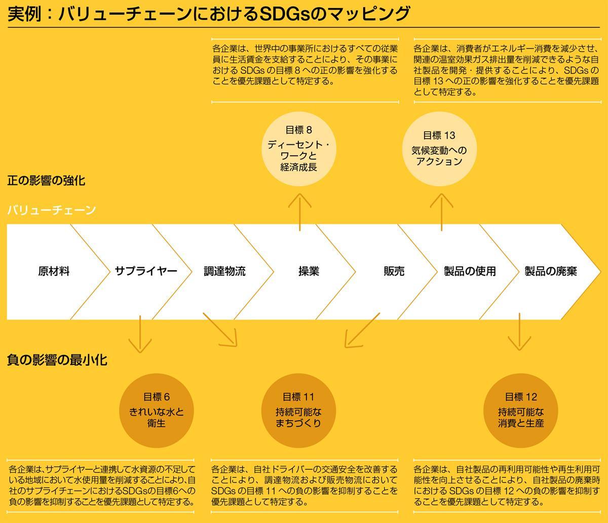 このステップでは、バリューチェーン全体(原材料の供給拠点・調達物流から生産・事業を経て製品の製造・販売・使用・廃棄に至るまで)を俯瞰して図式化(マッピング)し、各段階に関わる企業や団体が社会的課題に対して正・負の影響を与えている点を把握します。把握した正・負の影響の中から、自社の優先課題とするものを決定します。