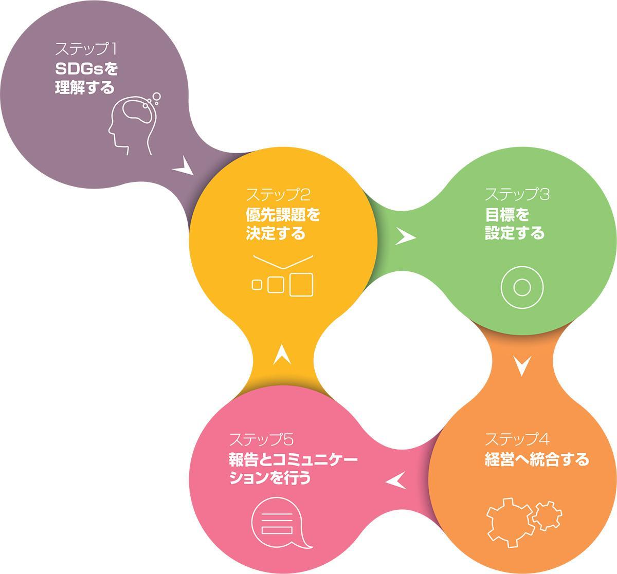 最近では中小企業が参照しているケースも多く見受けられ、この指針で示されるステップに沿ってSDGsへの取り組みを始めることが国内でも主流のアプローチ方法となっています。具体的なステップは以下の通りです。