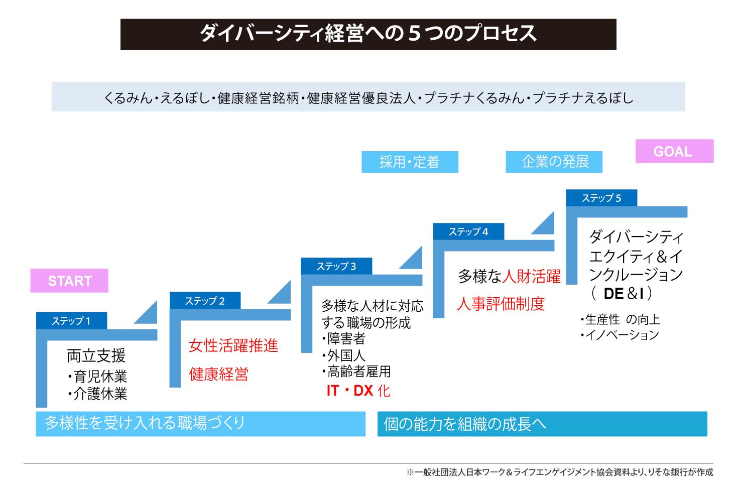 企業によって、このステップの内容や順番は異なります。女性がいない企業であれば、外国人への対応から始めるという場合もあるでしょう。いずれにせよ、女性活躍だけに目を向けていると、せっかくえるぼし認定を取得しても形骸化してしまうことになりかねません。女性活躍はあくまで、企業が大きなゴールに至る道筋のひとつ。言い換えれば、企業は女性活躍という土台を整えてはじめて、次の成長ステップに進むことができるのです。(女性活躍については、「データで見る「女性活躍」の現状」も参照ください)