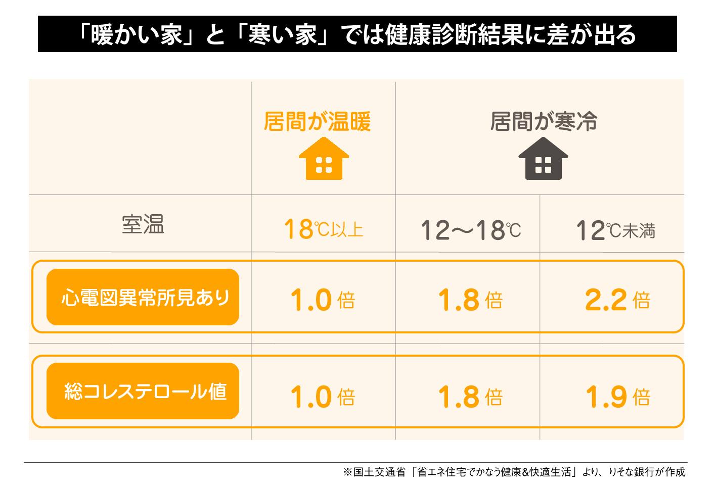 温度、騒音、照度、衛生、安全、防犯に問題がない住環境の人々は、QOL(生活の質)が高いことがわかっています。実際、室温が18℃以上の住宅に住む人と、12℃未満の住宅に住む人とでは、後者は前者に比べて心電図に異常所見のある人が2.2倍、総コレステロール値が基準範囲を超える人が1.9倍になるという研究結果も出ています。