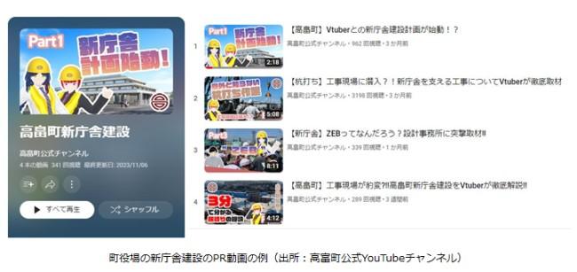 山形県高畠町では、町役場の新庁舎建設のPR動画にVTuberを起用しています。アバターの制作と取材を米沢工業高校専攻科の学生が手掛けており、高畠町の公式YouTubeでVTuberが工事現場の裏側や新庁舎建設に携わる人を紹介するなどの情報発信を行っています。動画は開庁までの約2年間、毎月1回配信する計画です。