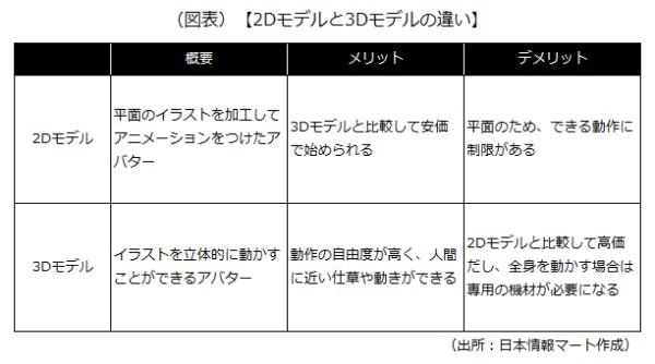 VTuberを起用するには、まずは2Dモデルもしくは3Dモデルのアバターを用意します。2Dモデルと3Dモデルにはそれぞれ次のような違いがあります。