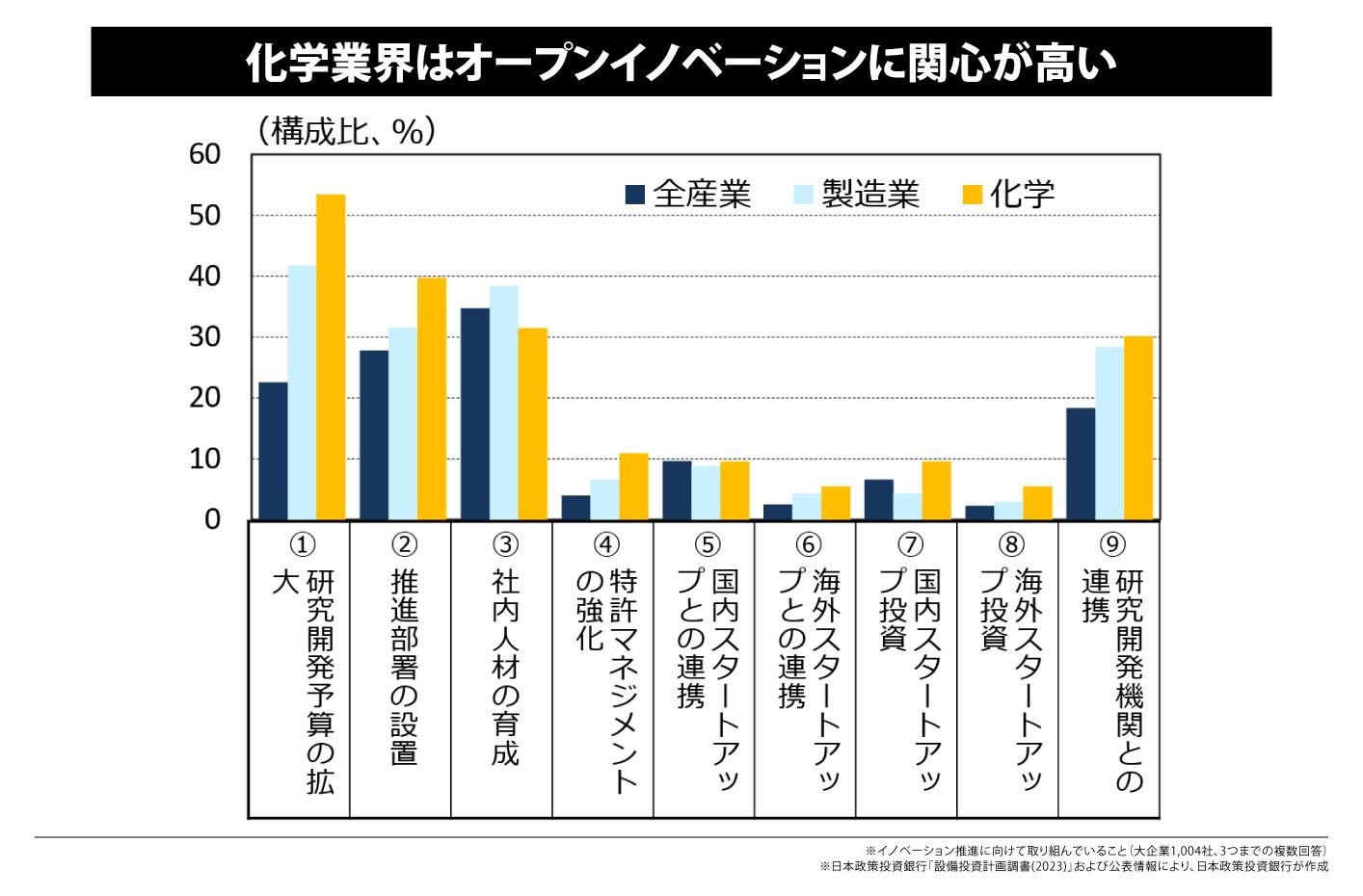 武田薬品工業やアステラス製薬などの事業者も賃貸ラボに取り組んでおり、オープンイノベーションを目的としています。化学業界は、他の産業と比べてもオープンイノベーションに積極的な業界です。(下図参照)
