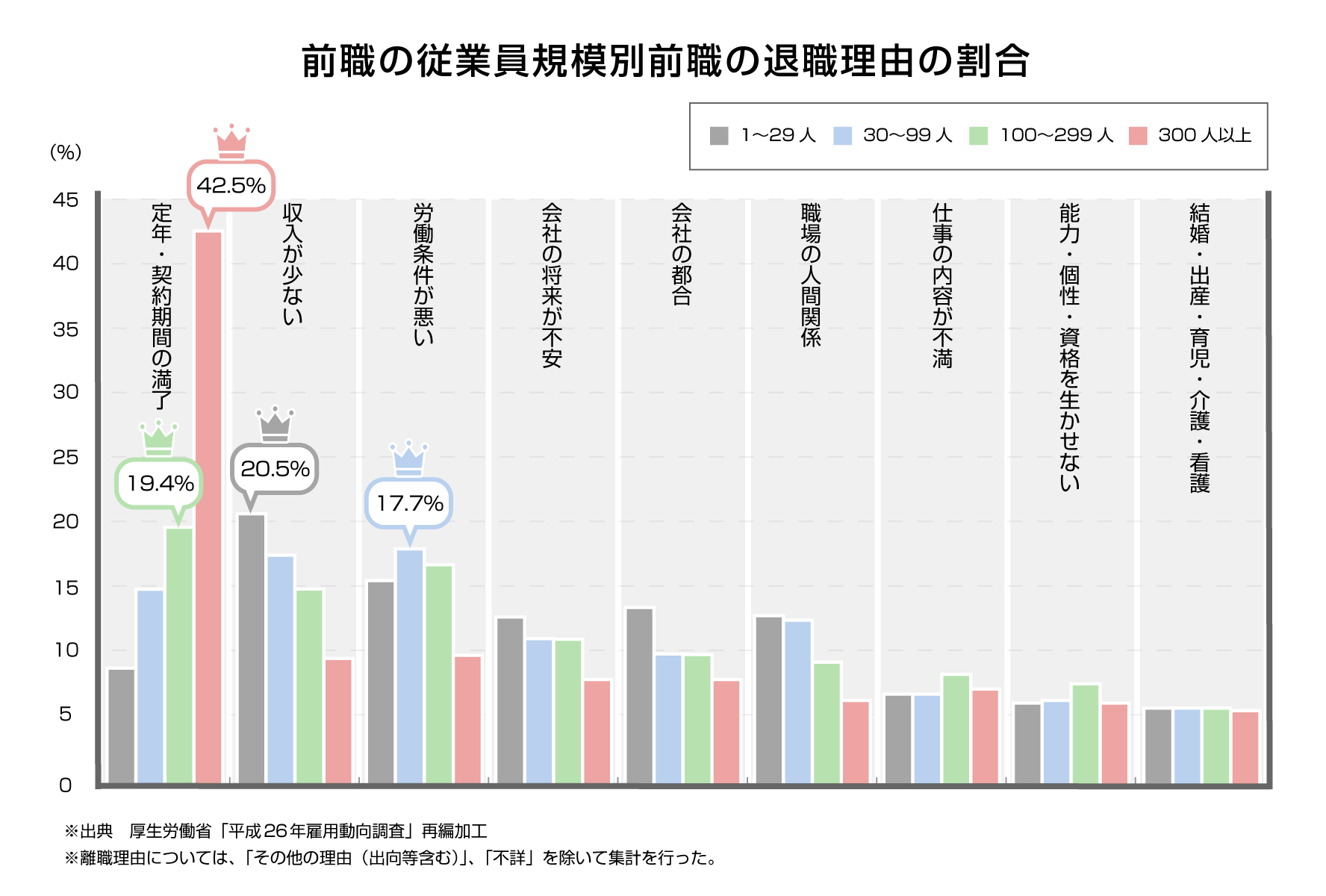 もう少し細かく見ていくと、「仕事の内容に興味を持てなかった」「能力・個性・資格を生かせなかった」という回答も一定数あります。自身の働きを認めてもらえているか・キャリアアップができているか。一言で言うと「仕事にやりがいがあるかどうか」を従業員が重視していると読み取れるでしょう。