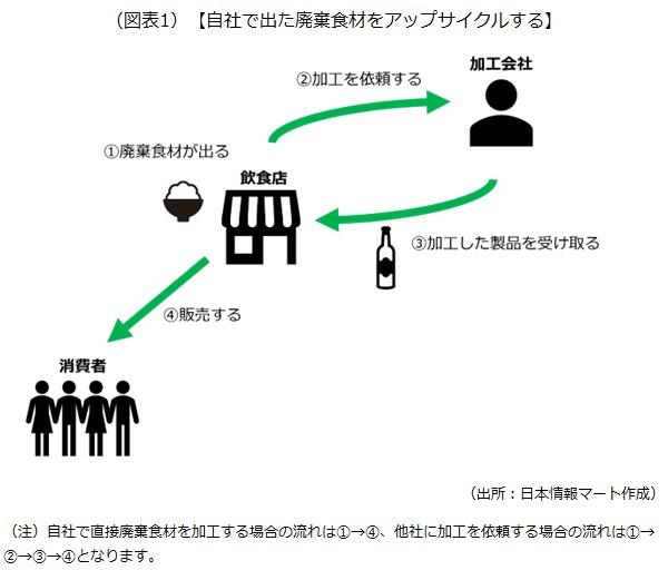 自社で出た廃棄食材をアップサイクルする場合、自社で直接加工して消費者に販売するケース、他社に加工を依頼して加工後の商品を販売するケースなどがあります。具体的な事例は後述しますが、流れのイメージは図表1の通りです。