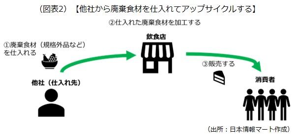 自社ではほとんど廃棄食材が出ない代わりに、他社で出た廃棄食材を自社で加工して販売・提供するケースもあります。例えば、農家が規格外や傷があるために廃棄するフルーツなどを仕入れて加工し、販売するといった具合です。流れのイメージは図表2の通りです。
