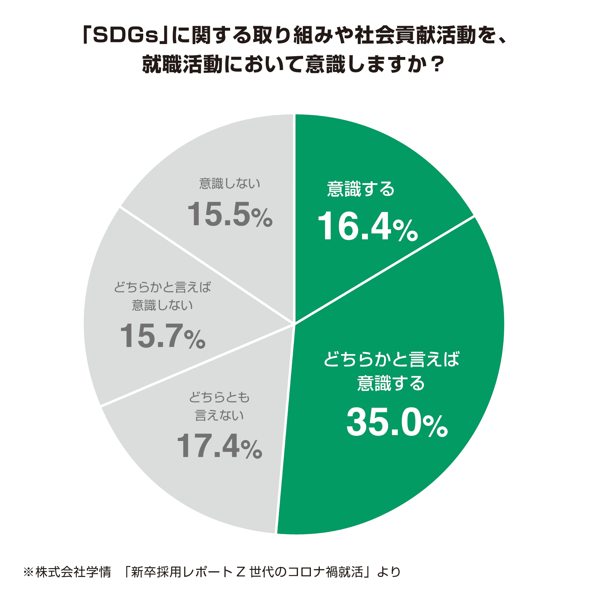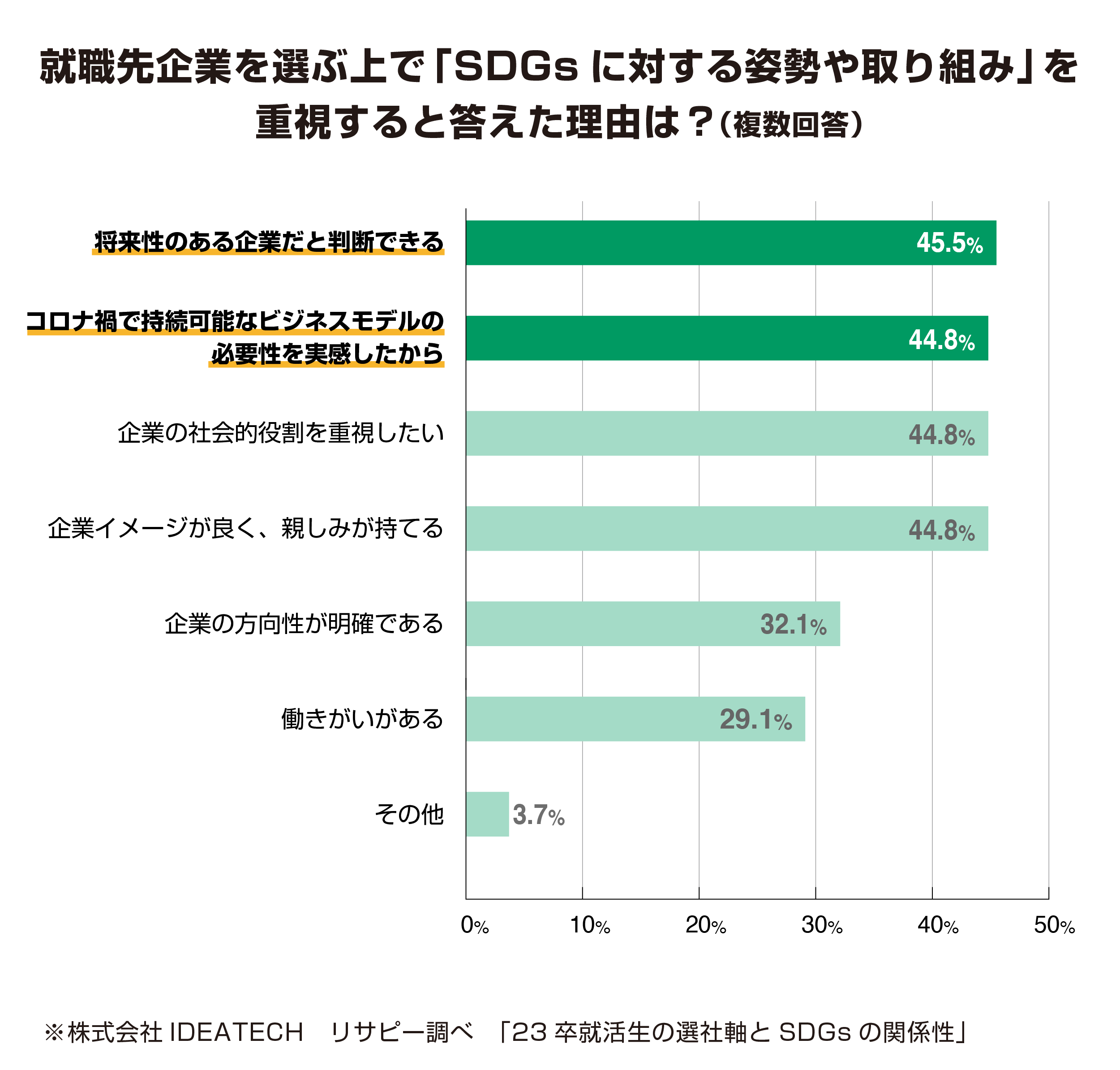 同じ調査では、「就職先企業を選ぶ上でSDGsに対する姿勢や取り組みを重視する」と答えた学生に対し、さらにその理由を問いかけています。「将来性のある企業だと判断できる」に次いで多かったのが、「企業イメージが良く、親しみが持てる」という理由でした。さらに「コロナ禍で持続可能なビジネスモデルの必要性を実感したから」という理由もあり、自然災害や新型コロナウイルスのまん延による社会生活の変化など、避けようのない事態にもフレキシブルに対応し、どんな状況でも社会から求められ続けるビジネスモデルであるかも、将来性判断の重要な軸になっていると見ることができます。