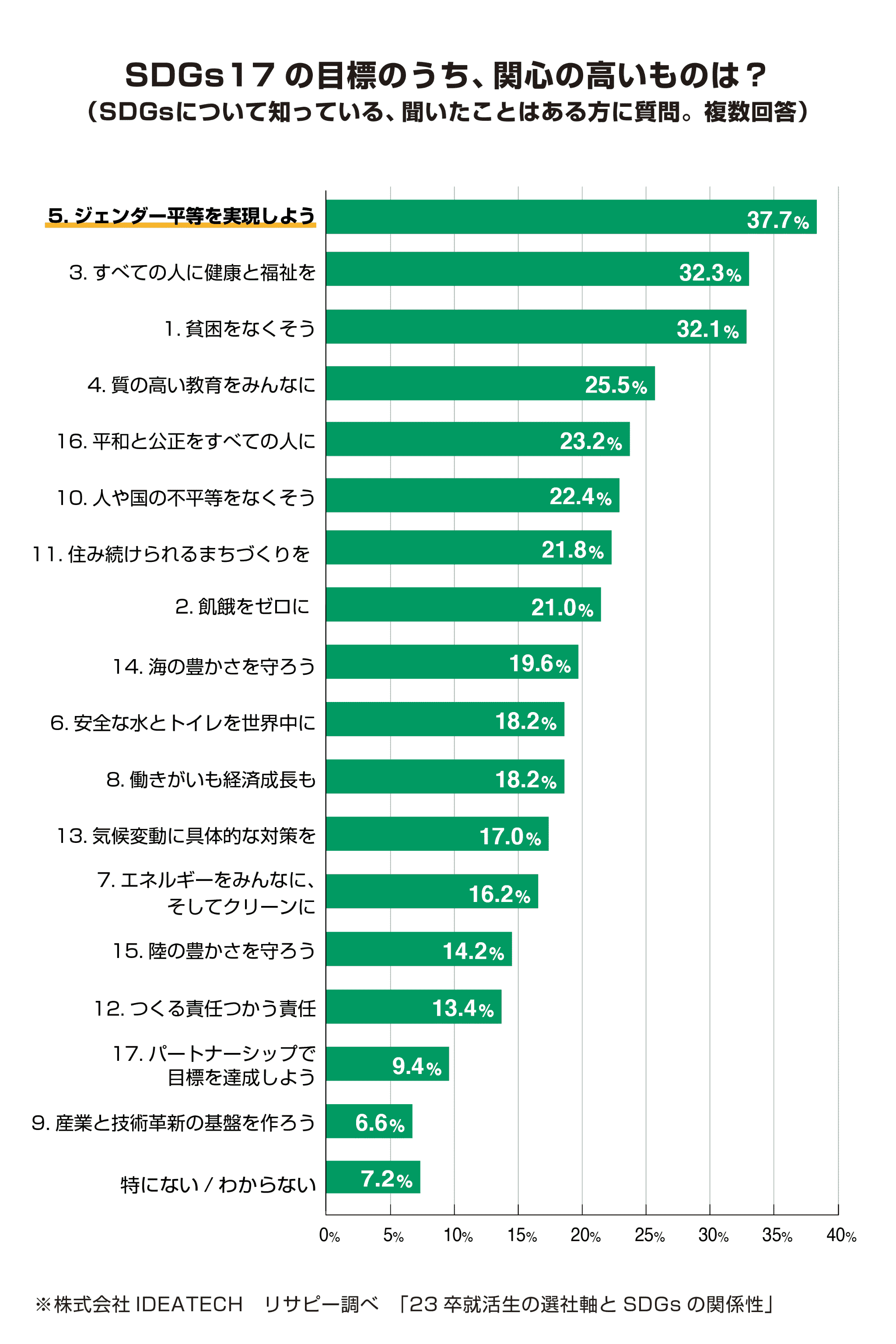 また、同調査において「SDGs17の目標のうち関心の高いものはどれですか?」という質問の回答数トップは「5. ジェンダー平等を実現しよう」でした。本業でのSDGsへの取り組みと共に、女性活躍や男性の育休取得、多様な働き方を支える社内制度の充実を伝えることも、SDGsへ積極的である企業姿勢を示すことにつながります。